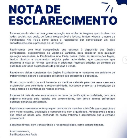 Uma panificadora foi acusada de vender o bolo com um rato dentro. Por meio de nota, o estabelecimento negou as acusações e que as acusações estão sendo feitas de forma leviana e irresponsáveis.
