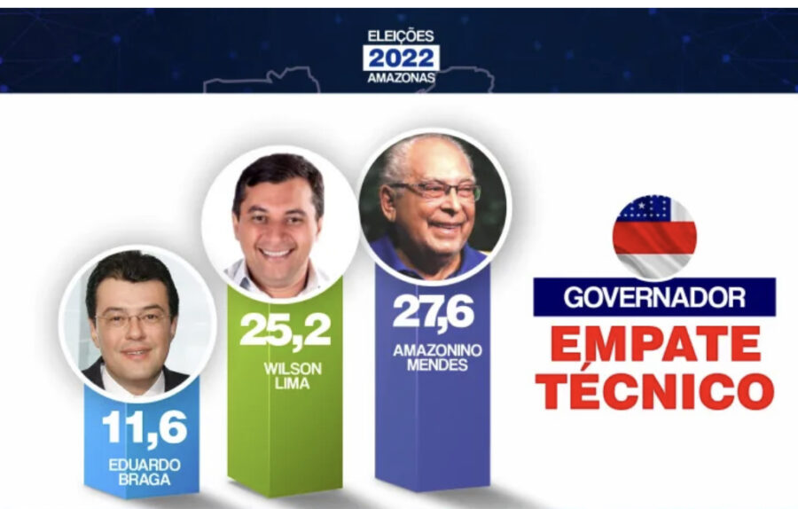 O ex-governador Amazonino Mendes (Cidadania) e Wilson Lima (União Brasil) têm empate técnico na corrida eleitoral para o Governo do Amazonas. Mendes aparece com 27, 6% das intenções de voto e o atual chefe do Executivo local, Wilson Lima, com 25,2% no cenário de intenções de voto, quando os nomes dos candidatos são apontados. Como a pesquisa tem margem de erro percentuais para mais ou para menos, o ex-governador e o atual estão praticamente empatados na corrida para o chefe do executivo estadual, a margem de erro para ou para o outro é praticamente decisivo.