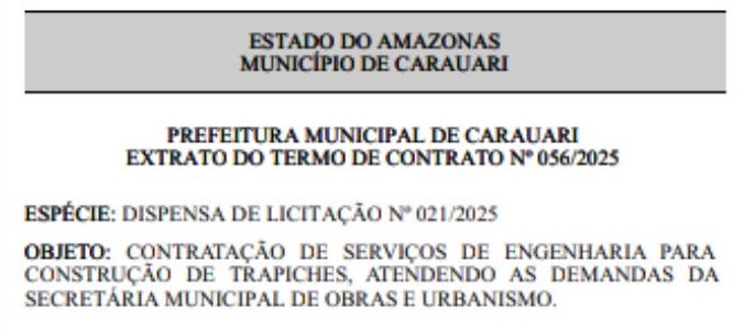 O contrato entre a Prefeitura de Carauari e a DOMUS SERVIÇOS DE ENGENHARIA LTDA vai de março a setembro deste ano, para a construção de trapiches, que é uma estrutura de madeira construída sobre a água em formato de ponte, destinada à passagem de pessoas durante as cheias dos rios.