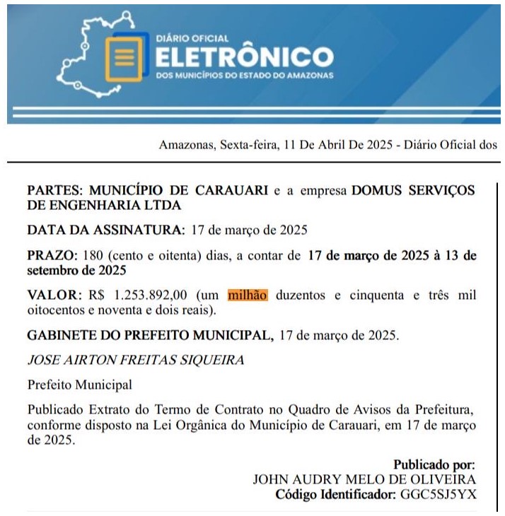 Segundo publicações do Diário Oficial dos Municípios (DOM) desta sexta-feira (11), mostra que Airton Siqueira vai gastar R$ 1.253.892,00 (um milhão, duzentos e cinquenta e três mil, oitocentos e noventa e dois reais), com a empresa DOMUS SERVIÇOS DE ENGENHARIA LTDA, para demanda da Secretaria Municipal de Obras e Urbanismo de Carauari.