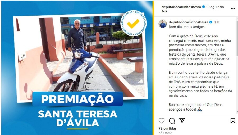 Para tentar não parece uma campanha antecipada, Carlinhos Bessa informou em suas redes sociais, nesta terça-feira (26), que a moto será uma das premiações de um “grande bingo” do festejo de Santa Teresa D’Ávila, que arrecadará recursos que irão “ajudar na missão de levar a palavra de Deus”.