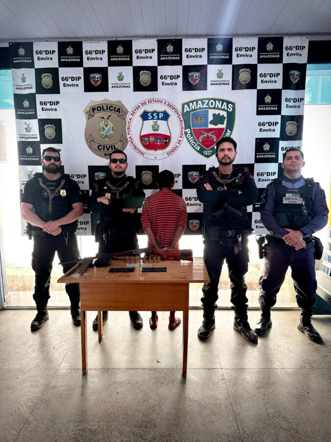 A Polícia Civil do Amazonas (PC-AM), por meio da 66ª Delegacia Interativa de Polícia (DIP) de Envira (a 1.208 quilômetros de Manaus), em ação integrada com a Polícia Militar do Amazonas (PMAM), prendeu em flagrante, na quarta-feira (18/06), um homem, de 48 anos, por cárcere privado e posse ilegal de arma de fogo contra a sua companheira, de 44 anos. A prisão ocorreu no município.