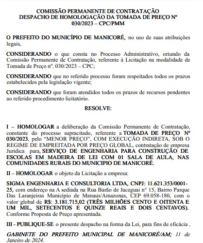 A empresa SIGMA ENGENHARIA E CONSULTORIA LTDA foi a contemplada com o contrato milionário no valor total de R$ 3.181.715,02 (três milhões, cento e oitenta e um mil, setecentos e quinze reais e dois centavos), em pleno ano eleitoral em que o prefeito busca sua reeleição.