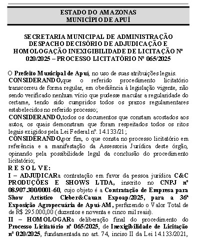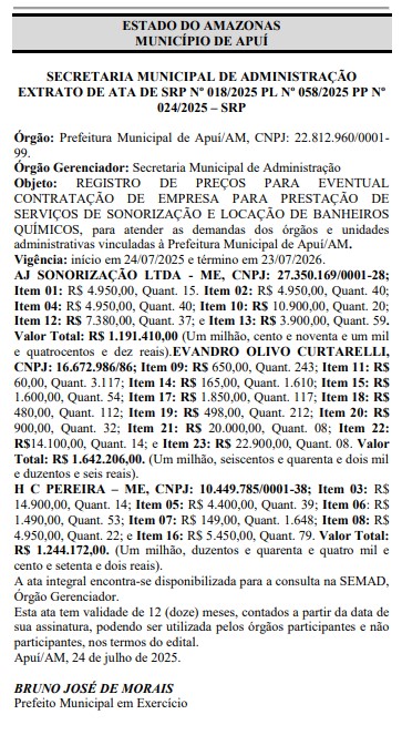Ao total, a Prefeitura de Apuí vai gastar o total de R$ 4.077.788,00 (quatro milhões, setenta e sete mil, setecentos e oitenta e oito reais), em aluguel de equipamentos de sonorização e banheiros químicos para a 36ª Exposição Agropecuária de Apuí (Expoap/2025).