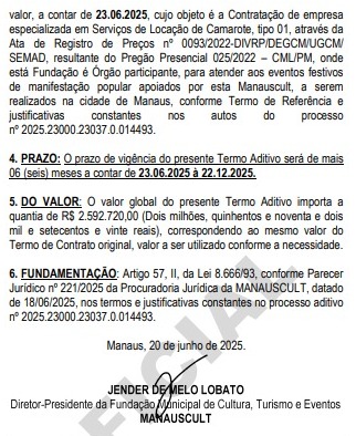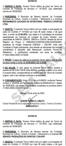 O Diário Oficial do Município (DOM) desta última terça-feira (15/07), mostra que a Prefeitura de Manaus renovou o contrato da empresa BERGAMO LOCAÇÃO DE ESTRUTURAS, TRENDAS E EVENTOS LTDA, por mais seis meses no valor total de R$ 6.044.190,00 (seis milhões, quarenta e quatro mil, cento e noventa reais), em aditivo, para o aluguel de grupos geradores para festas na cidade.
