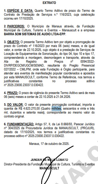 De acordo com o Diário Oficial do Município (DOM), David e o diretor-presidente da Manauscult Jender Lobato, irmão do vereador Jander Lobato (PSD), assinaram uma renovação de contrato com a empresa BARRA SOM SISTEMAS DE ÁUDIO LTDA-EPP, no valor de R$ 4.623.270,00 (quatro milhões, seiscentos e vinte e três mil, duzentos e setenta reais), para o aluguel de aparelhagem de som para festa, por apenas seis meses.