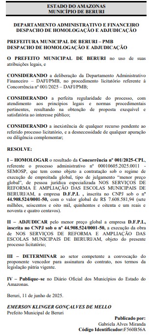 De acordo com informações do Diário Oficial dos Municípios (DOM) desta quinta-feira (12), Emerson Mello vai contratar a empresa D. F. P. L. LTDA pelo valor total de R$ 7.608.581,94 (sete milhões, seiscentos e oito mil, quinhentos e oitenta e um reais e noventa e quatro centavos), para os serviços de reforma e ampliação de escolas no município de Beruri.