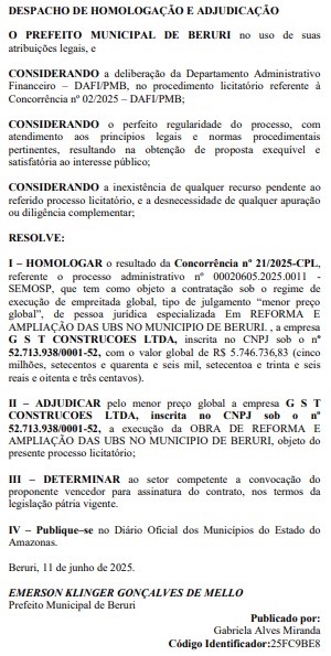 Já em um segundo contrato homologado no DOM, a Prefeitura de Beruri vai contratar a empresa G. S. T. CONSTRUÇÕES LTDA pelo valor total de R$ 5.746.736,83 (cinco milhões, setecentos e quarenta e seis mil, setecentos e trinta e seis reais e oitenta e três centavos), para obra de reforma e ampliação nas Unidades Básicas de Saúde (UBS’s), no município.