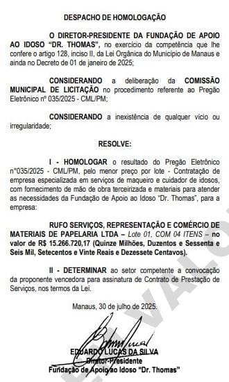 De acordo com a publicação do Diário Oficial de Manaus (DOM), a empresa RUFO SERVIÇOS, REPRESENTAÇÃO E COMÉRCIO DE MATERIAIS DE PAPELARIA LTDA, vai receber o total de R$ 15.266.720,17 (quinze milhões, duzentos e sessenta e seis mil, setecentos e vinte reais e dezessete centavos), para atender as demandas da Fundação Dr. Thomas.