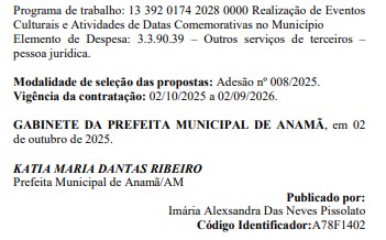 A prefeita Kátia Dantas (MDB), vai gastar mais de R$ 740 mil reais para a realização de eventos culturais no município de Anamã, no interior do Amazonas, e quem vai receber essa bolada é uma empresa de informática.