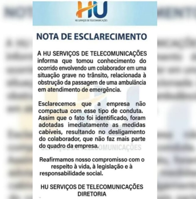 Em nota divulgada pela empresa HU Serviços de Telecomunicações, informou que assim que tomou conhecimento das imagens que circulam na internet com um funcionário bloqueando a passagem de uma ambulância, e ameaçando os profissionais com um martelo, foi desligado da empresa.