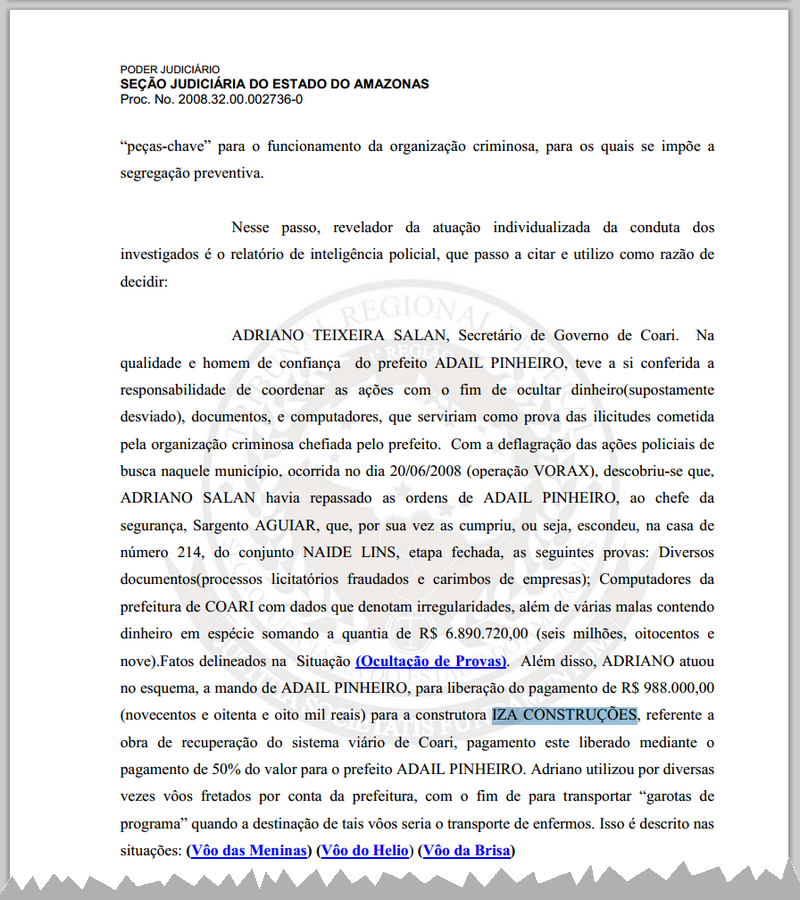 A empresa IZA CONSTRUÇÕES E COMÉCIO LTDA foi alvo de investigação da Polícia Federal (PF) em um esquema de fraudes nas licitações do município de Coari, na primeira passagem de Adail Pinheiro (republicanos) na Prefeitura Municipal de Coari no interior do Amazonas.