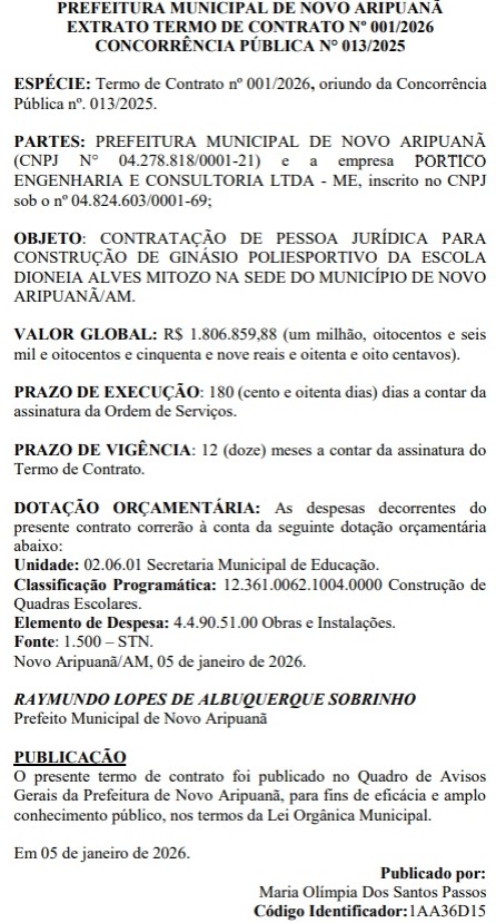 De acordo com o Diário Oficial dos Municípios (DOM), desta segunda-feira (20/01), Raiz contratou a empresa PORTICO ENGENHARIA E CONSULTORIA LTDA – ME, pelo valor total R$ 1.806.859,88 (um milhão, oitocentos e seis mil, oitocentos e cinquenta e nove reais e oitenta e oito centavos), para construir uma quadra poliesportiva na Escola Municipal Dioneia Alves Mitozo em Novo Aripuanã.