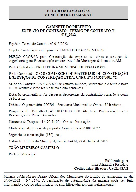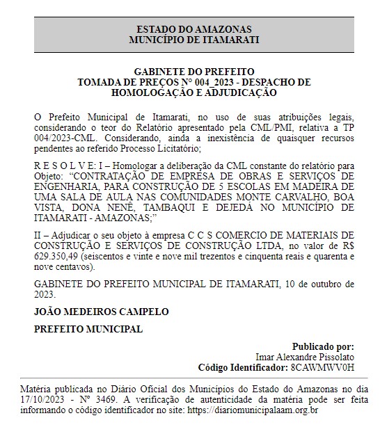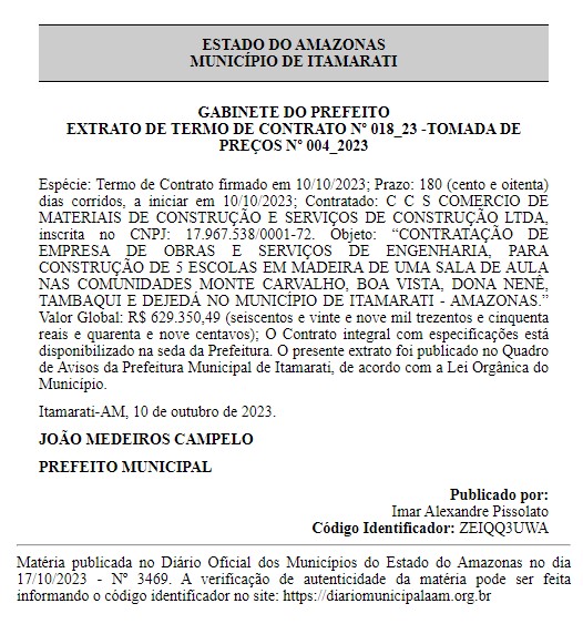 O prefeito municipal de Itamarati João Campelo, contratou a empresa C C S COMERCIO DE MATERIAIS DE CONSTRUÇÃO E SERVIÇOS DE CONSTRUÇÃO LTDA, para a construção de escolas em madeira nas comunidades Monte Carvalho, Boa Vista, Dona Nenê, Tambaqui e Dejedá naquele município.