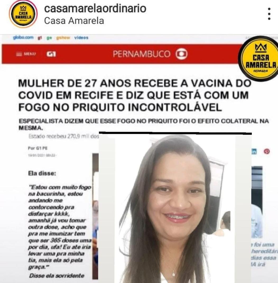 Uma enfermeira do nordeste do País disse que recebeu a vacina e de repente começou vim as reações. De acordo com a jovem, ela ficou com um fogo incontrolável na perseguida.