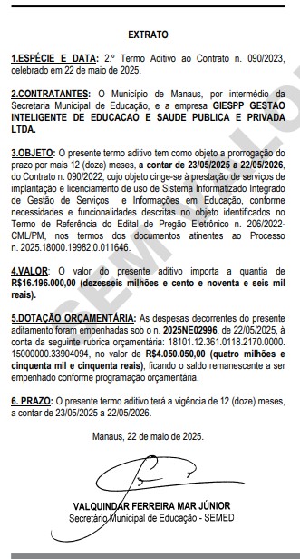 De acordo com o Diário Oficial de Manaus desta sexta-feira (18), a empresa GIESPP GESTÃO INTELIGENTE DE EDUCAÇÃO E SAÚDE PÚBLICA E PRIVADA LTDA, vai receber o total de R$ 16.196.000,00 (dezesseis milhões, cento e noventa e seis mil reais), de aditivo de contrato por mais 12 meses.