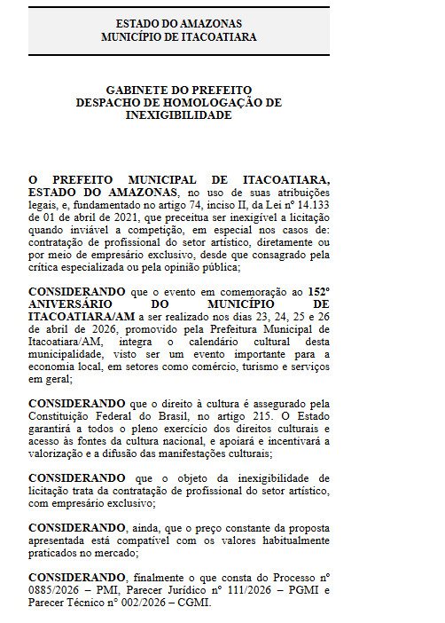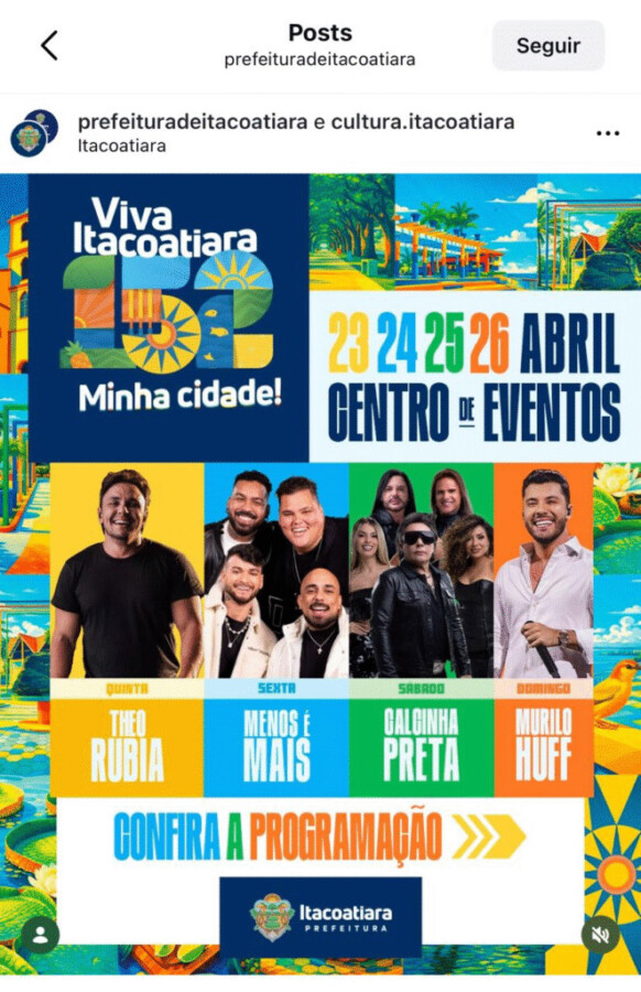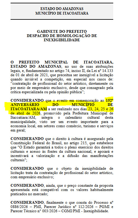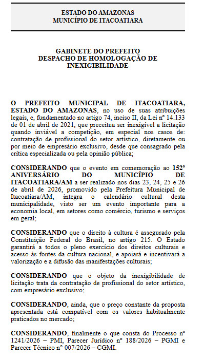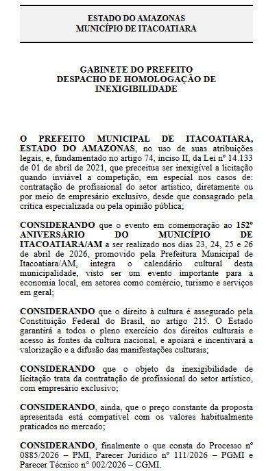 O 152º Aniversário de Itacoatiara ocorreu nos dias 23, 24, 25 e 26 de abril e até o momento, a Prefeitura de Itacoatiara não divulgou os acordos feitos com outros artistas locais.