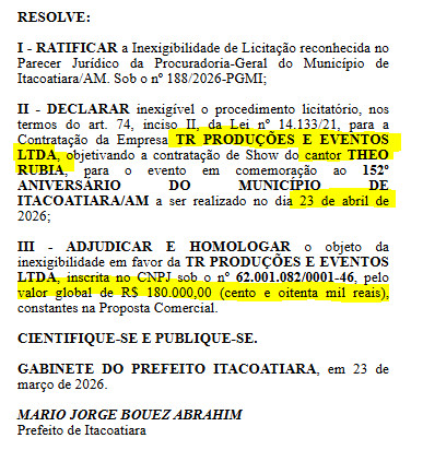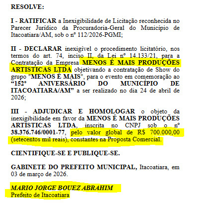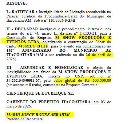 O prefeito Mário Abrahim (Republicanos), deve ser investigado pelos órgãos de fiscalização do poder público, pelo gasto de mais de R$ 2 milhões em contratações de artistas nacionais para o 152º Aniversário de Itacoatiara.