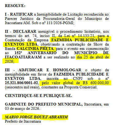 Já a banda CALCINHA PRETA, fechou um contrato com a Prefeitura de Itacoatiara por R$ 600 mil reais, por meio da empresa FAZMIDIA PUBLICIDADE E EVENTOS LTDA.