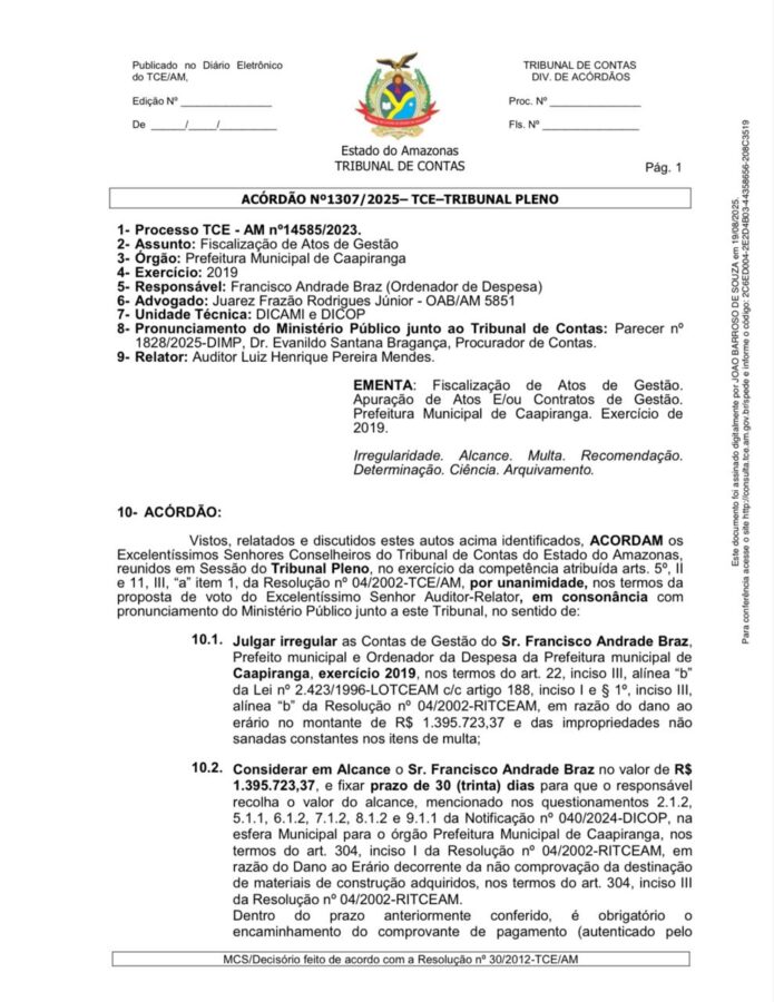 Caapiranga- O município de Caapiranga (AM), distante 147 km de Manaus, voltou ao centro das atenções após mais uma condenação contra o ex-prefeito Francisco Andrade Braz, conhecido como Tico Braz. O Tribunal de Contas do Estado do Amazonas (TCE-AM) responsabilizou o ex-gestor por irregularidades milionárias e determinou a devolução de R$ 1.395.723,37 aos cofres públicos.
