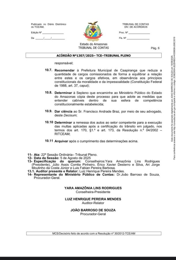 Segundo o relatório técnico do TCE-AM, a Prefeitura de Caapiranga adquiriu materiais de construção em 2019 sem qualquer comprovação de sua utilização. O relator do caso, auditor Luiz Henrique Pereira Mendes, foi categórico: houve dano ao erário e desrespeito aos princípios da transparência e da legalidade.