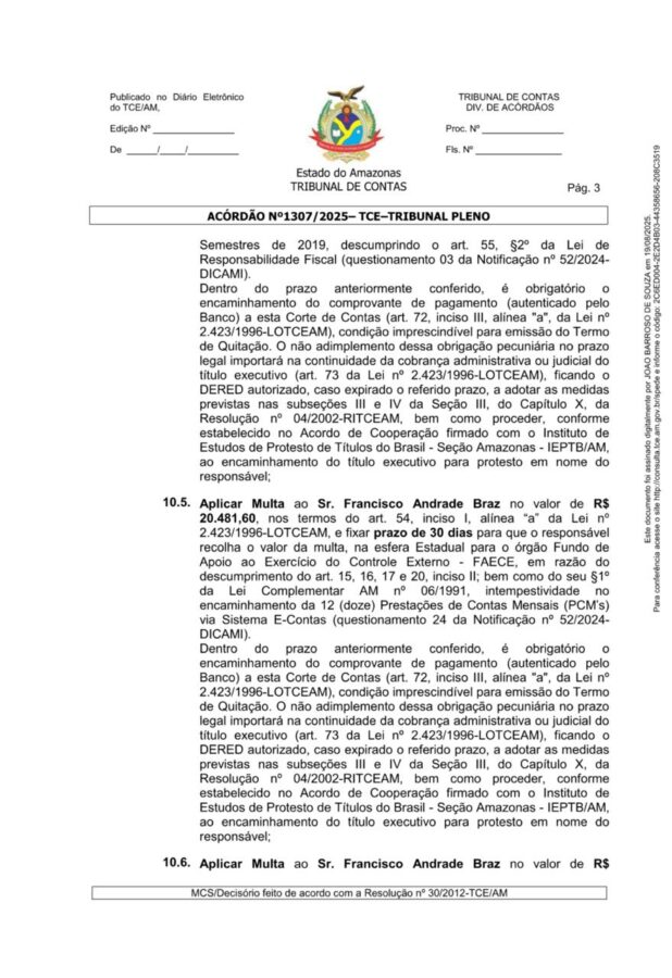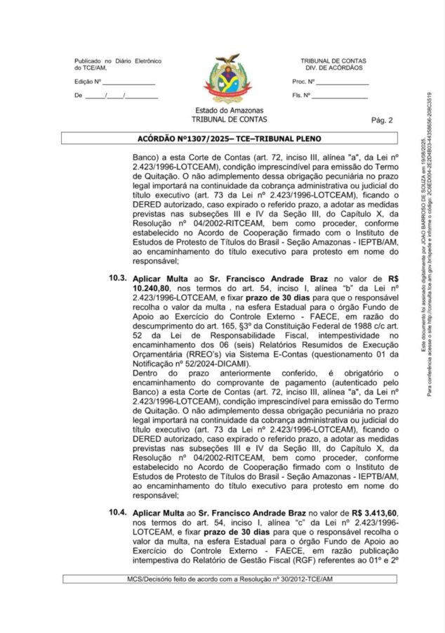 O tribunal, acompanhado do parecer do Ministério Público de Contas, determinou que o ex-prefeito devolva a quantia milionária em até 30 dias diretamente à Prefeitura de Caapiranga. Caso contrário, a dívida poderá ser executada judicialmente.