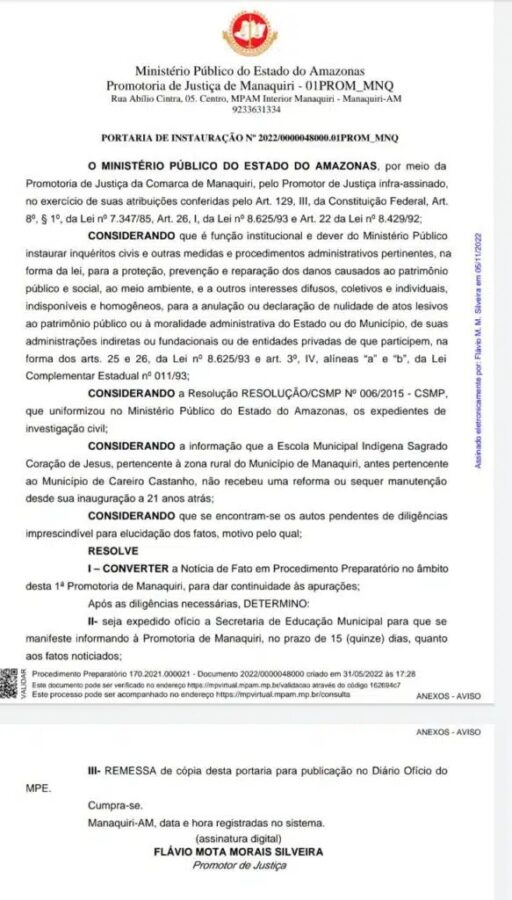 O documento, assinado pelo promotor de Justiça Flávio Mota Morais Silveira, determina que a Secretaria de Educação de Manaquiri se manifeste sobre os fatos no prazo de 15 dias. A cidade é comandada pelo prefeito Jair Souto (MDB), que também é presidente da Associação Amazonense dos Municípios (AAM).