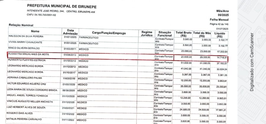 De acordo com o Portal da Transparência da Prefeitura de Eirunepé, a médica Rusmayara Mota é lotada no hospital de Eirunepé, recebendo um salário de R$ 14.718,81 (quatorze mil, setecentos e dezoito reais e oitenta e um centavos), sem pisar na cidade já que mora em Manaus com Elan Alencar.