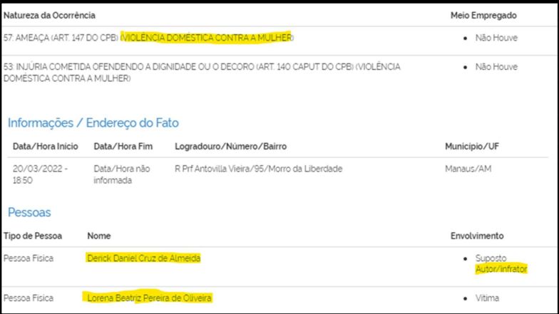 Entre 2021 e 2022, foram registrados boletins de ocorrência na Polícia Civil do Amazonas nos quais a ex-companheira de Derick relatou injúrias, ameaças, ameaça de morte e suposta agressão física. Também há registro de conflito relacionado ao cumprimento de acordo de guarda compartilhada da filha do casal.