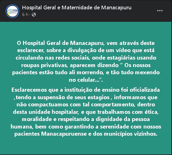 Em nota, o Hospital informou que a instituição de ensino foi oficializada e que os estágios foram suspensos em decorrência do episódio. A unidade hospitalar disse ainda que “não compactua com o comportamento dos alunos”, e que trabalha com “ética, moralidade e respeitando a dignidade da pessoa humana, bem como garantindo a serenidade com nossos pacientes Manacapuruense e dos municípios vizinhos”.