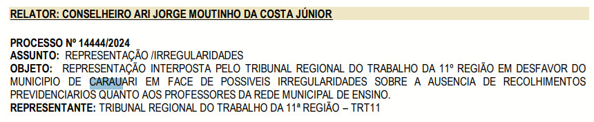 A representação ao TCE-AM foi apresentada pelo Tribunal Regional do Trabalho da 11ª Região (TRT-11), que mostrou a ausência de recolhimentos de valores previdenciários de professores da rede municipal de ensino de Carauari.