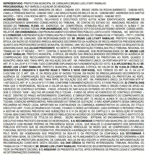 Bruno Litaiff foi multado em R$ 13.654,39 (treze mil, seiscentos e cinquenta e quatro reais e trinta e nove centavos), além de recomendar que a Prefeitura de Carauari levante o número de servidores públicos efetivos que se encontram sem o dinheiro de sua aposentadoria.