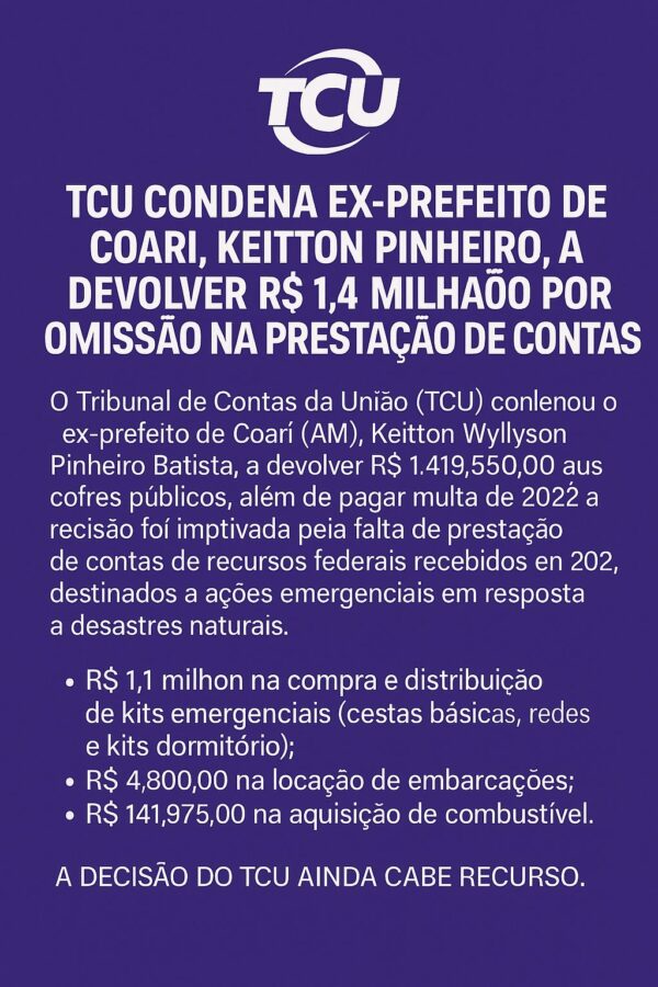 O ex-prefeito Keitton Wyllyson Pinheiro Batista, foi condenado pelo Tribunal de Contas da União (TCU), devolver R$ 1.419.550,00 (um milhão, quatrocentos e dezenove mil, quinhentos e cinquenta reais) aos cofres públicos da Prefeitura de Coari, no interior do Amazonas. Keitton Pinheiro ainda vai pagar uma multa de R$ 140 mil reais.