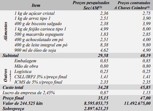Na auditoria, o TCU apontou um superfaturamento de R$ 2,8 milhões, em itens como achocolatado em pó e feijão comprados com valores acima da média. A Prefeitura de Manaus pagou R$ 4 por pacote de achocolatado em pó (400g), o setor técnico do órgão encontrou o mesmo produto por R$ 2,51, ou seja, com preço R$ 1,49 menor.
