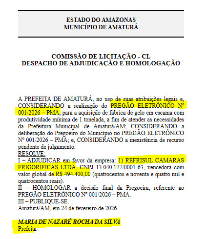 De acordo com informações do Diário Oficial dos Municípios (DOM), a empresa REFRISUL CÂMARAS FRIGORÍFICAS LTDA, vai receber R$ 494.400,00 (quatrocentos e noventa e quatro mil e quatrocentos reais), para fornecer gelo por apenas 90 dias em Amaturá.
