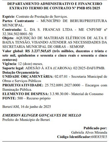 Emerson Mello vem realizando diversas contratações milionárias para a Prefeitura de Beruri, como no caso da compra das sandálias CROCS para alunos da rede municipal de ensino, que custaram R$ 446.248,00 (quatrocentos e quarenta e seis mil, duzentos e quarento e oito reais).
