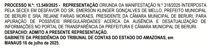 O Tribunal de Contas do Estado do Amazonas (TCE-AM), deve investigar a ausência de atualização nos portais oficiais da Prefeitura de Beruri e da Câmara Municipal de Beruri, comandadas pelo prefeito Emerson Mello (Podemos), e a vereadora Rejane Farias Moraes (Republicanos).