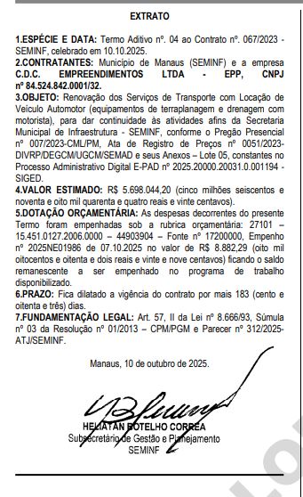 De acordo com o Diário Oficial do Município (DOM), a Prefeitura de Manaus por meio da Secretaria Municipal de Infraestrutura (Seminf), renovou por três vezes, o contrato de aluguel de máquinas pesada para terraplanagem e drenagem que já somam mais de R$ 31 milhões em aditivos.