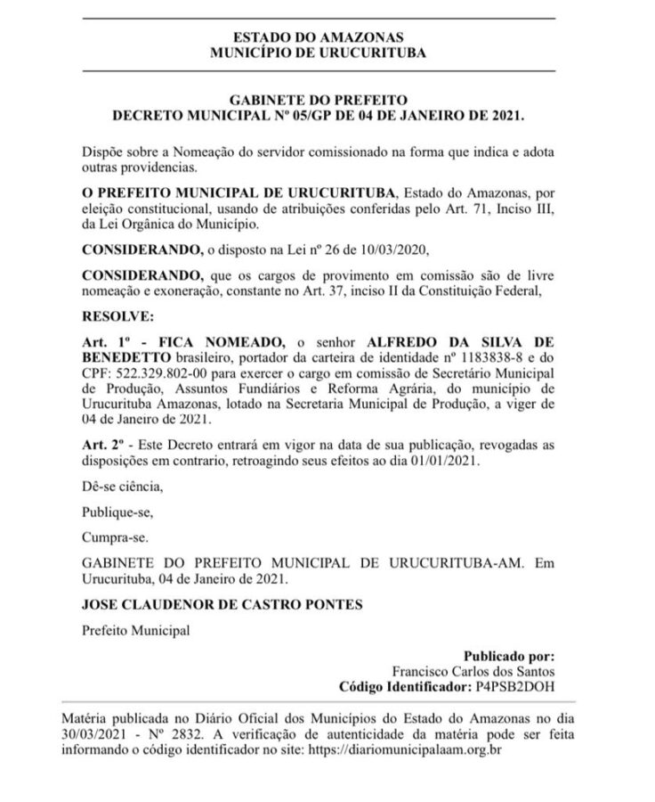 Não se sabe ao certo quanto a empresa que pertence ao secretário Alfredo Benedetto, a R DIAS DE BENEDETTO EIRELI, vai receber da prefeitura de Urucurituba, já que ao homologar os contratos no Diário Oficial dos Municípios (DOM), Sabugo fez questão de não informar quanto seria pago ao amigo secretário, para fornecer carne e frango para a prefeitura.