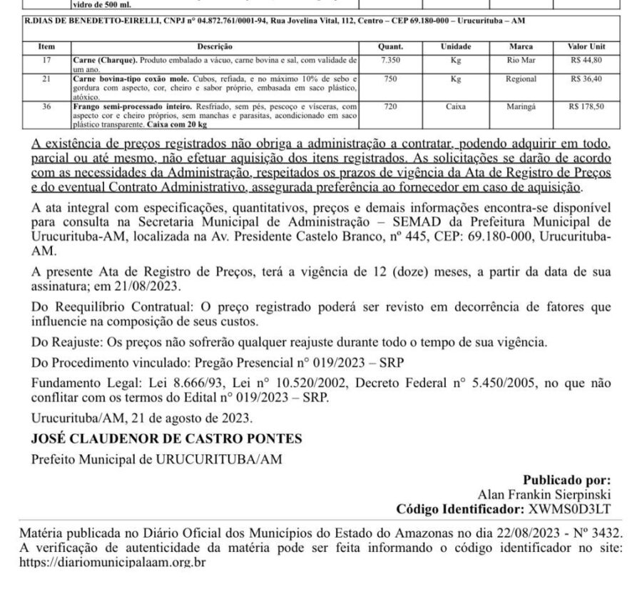 No documento disponibilizado pelo poder público no Diário Oficial, está apenas os itens e o valor pago à empresa de forma unitária, como carne do tipo charque no valor unitário de R$ 44,80 (quarenta e quatro reais e oitenta centavos), carne bovina do tipo coxão mole no valor unitário de R$ 36,40 (trinta e seis reais e quarenta centavos) por quilo e frango semi-processado inteiro, no valor unitário de R$ 178,50 (cento e setenta e oito reais e cinquenta centavos) a caixa.