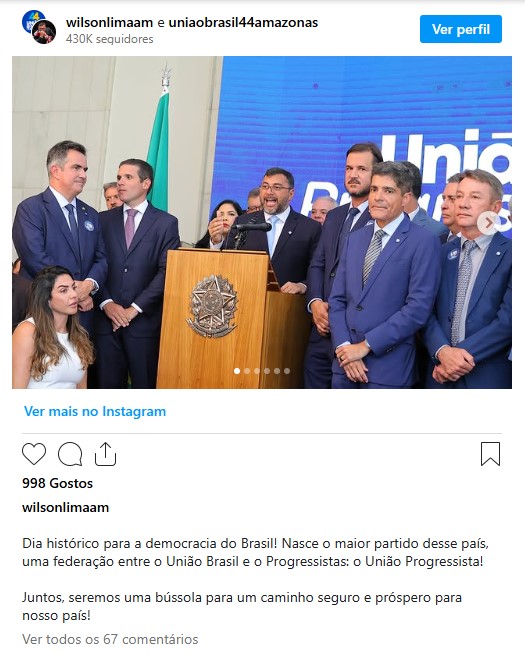 A Federação União Progressista deve fortalecer a base aliada do governador Wilson Lima na Câmara Municipal de Manaus (CMM), e o político comemorou a formação partidária em suas redes sociais.