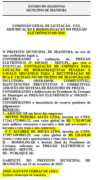 Em mais uma licitação com suspeitas de irregularidades, o prefeito Augusto Ferraz (UB), vai contratar duas empresas para segundo ele, alugar máquinas para asfaltar ruas e vicinais no município de Iranduba.
