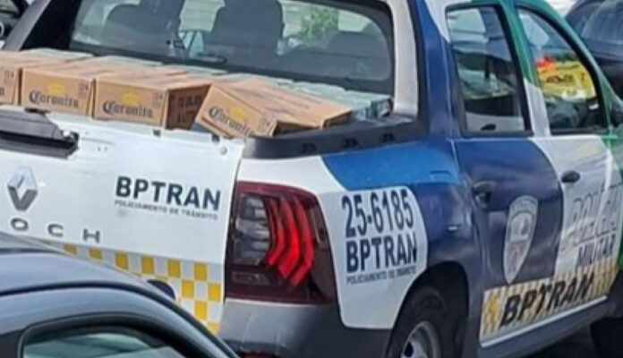 O registro foi feito por populares e compartilhado nas redes sociais, mostra uma viatura do BPTRAN-AM, transportando cervejas da marca Corona na carroceria do veículo.