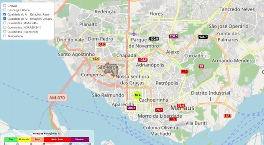 De acordo com o aplicativo Selva, lançado recentemente pela Universidade do Estado do Amazonas (UEA), que apontou que a qualidade do ar nas zonas Sul e Oeste está no nível péssimo, tendo uma concentração de MP2.5 acima de 200.