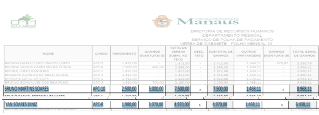 De acordo com a denúncia, Yan Soares foi contratado para gerir as redes sociais do vereador, mas não acumula frequência na Câmara, sendo que Bruno e Yan entraram na Câmara Municipal como APC-11 e APC-10, e hoje os irmãos estão como APC- 10 e 8, respectivamente, com salários entre R$ 8.968,11 e R$ 6.438,11, conforme mostra a lista de relação de servidores do departamento pessoal da CMM.