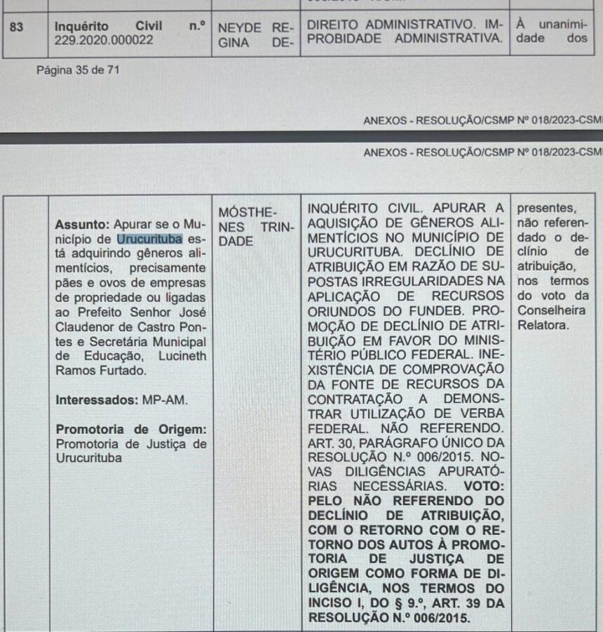 O Ministério Público do Amazonas (MP-AM), investiga o prefeito de Urucurituba, José Claudenor de Castro Pontes, o “Sabugo” (PT), em um esquema envolvendo a compra de gêneros alimentícios de empresas ligadas à ele e a secretária de educação do município Lucineth Ramos Furtado.