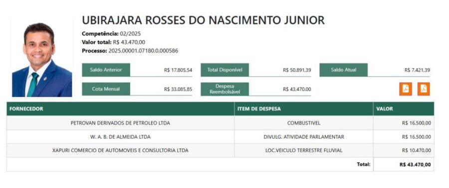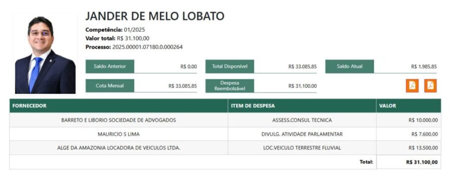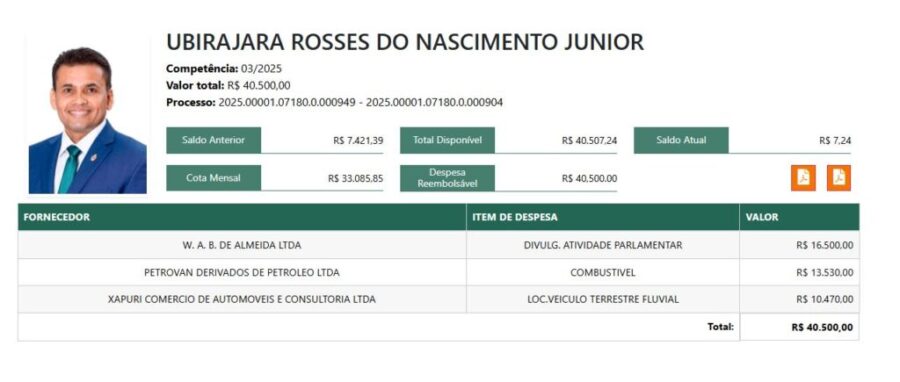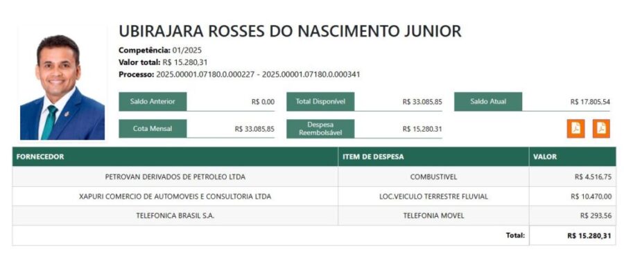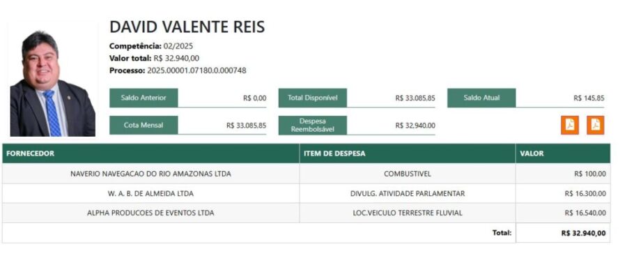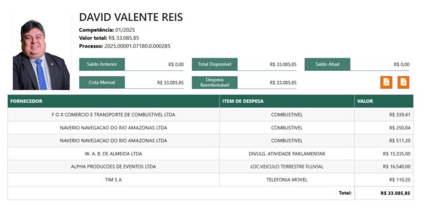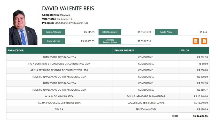 Entre os vereadores que mais gastaram o cotão nos últimos meses, está o presidente da Câmara David Reis (Avante), que aparece com gastos no total R$ 99.253,01 (noventa e nove mil, duzentos e cinquenta e três reais e um centavo).