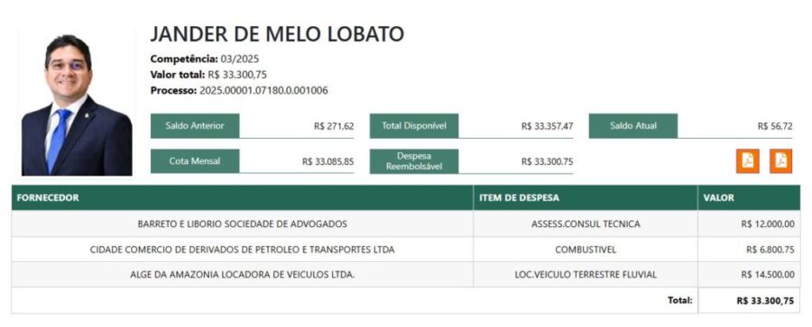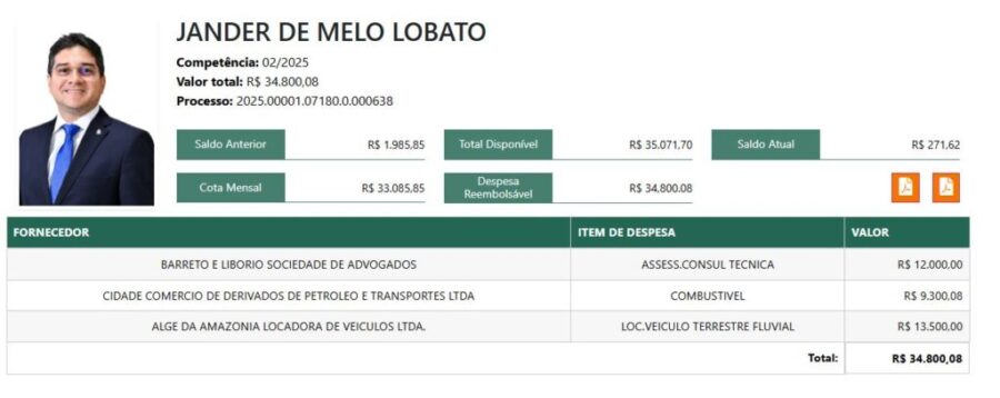 O terceiro parlamentar que mais gastou os recursos do Cotão, foi o vice-presidente da Casa Legislativa Jander Lobato (PSD), que desembolsou dos cofres públicos R$ 99.200,83 (noventa e nove mil, duzentos reais e oitenta e três centavos).