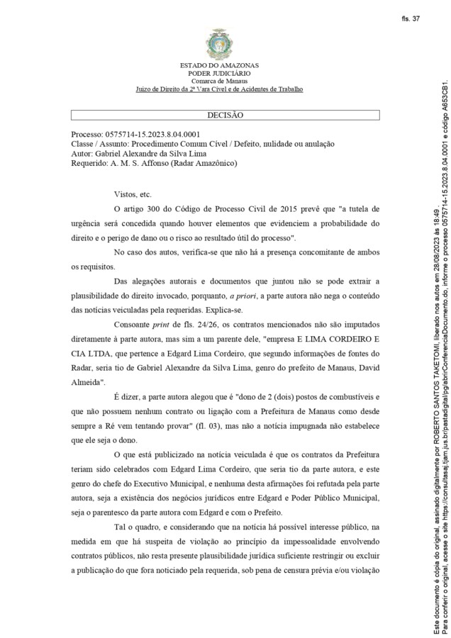 O genro do prefeito tentou calar alguns portais por noticiar o contrato da Prefeitura de Manaus com seu primo Edgar Lima Cordeiro, mas o Tribunal de Justiça do Amazonas (TJAM), negou e manteve as notícias divulgadas pelos portais.