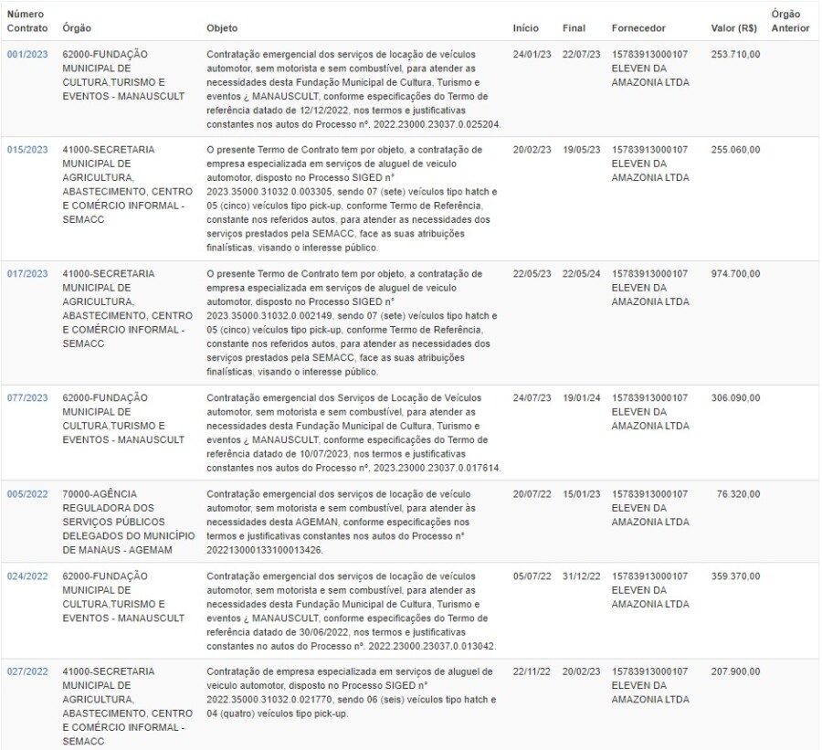 ELEVEN DA AMAZÔNIA soma contratos que chegam a R$ 2,4 milhões com dispensa de licitação para as secretarias de Cultura, Turismo e Eventos (Manauscult), e de Agricultura, Abastecimento, Centro e Comércio Informal (Semacc), além da Agência Reguladora dos Serviços Públicos Delegados do Município de Manaus (Agemam).
